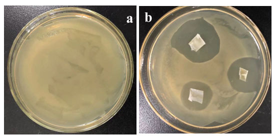 图1. 培养基培养24小时后抗菌水管抑菌圈测试效果图(a:对照样;b:放置抗菌水管片样)